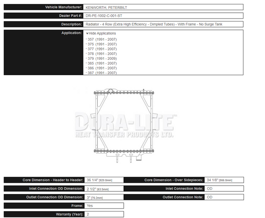 Extra High Effiency Radiador for Peterbilt 379 (1991-2007) No Tank Dimpled Tube | Dura-Lite